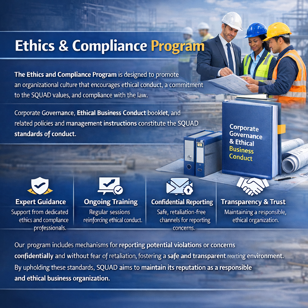 The program is supported by a dedicated ethics and compliance function that provides guidance and support to employees at all organizational levels. Regular training programs and internal communication initiatives are implemented to reinforce the importance of ethical business practices and to ensure employees remain informed of updates to SQUAD’s standards and policies.