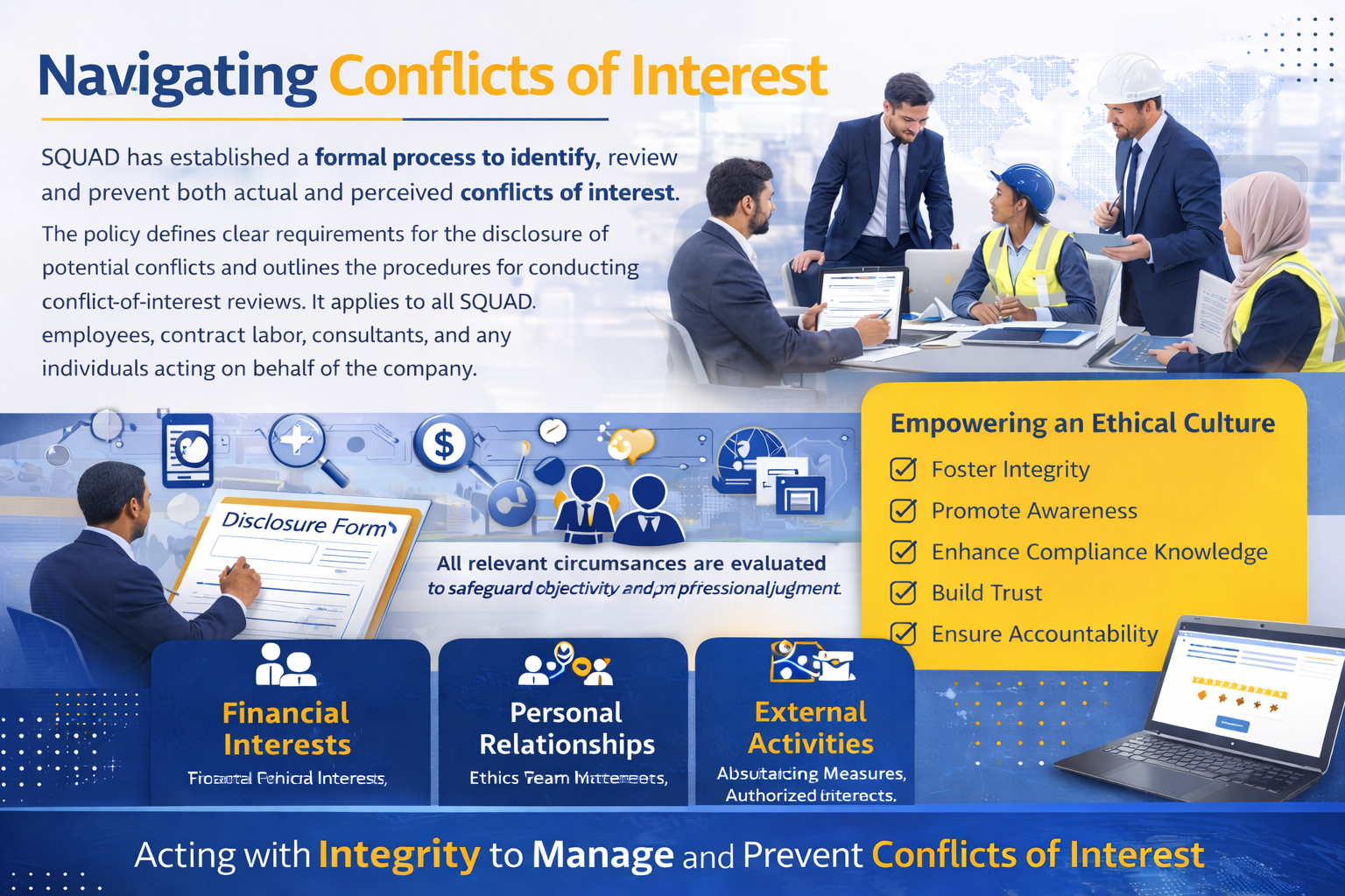 SQUAD has established a formal process to identify, review, and prevent both actual and perceived conflicts of interest. The policy defines clear requirements for the disclosure of potential conflicts and outlines the procedures for conducting conflict-of-interest reviews. It applies to all SQUAD employees, contract labor, consultants, and any individuals acting on behalf of the company.